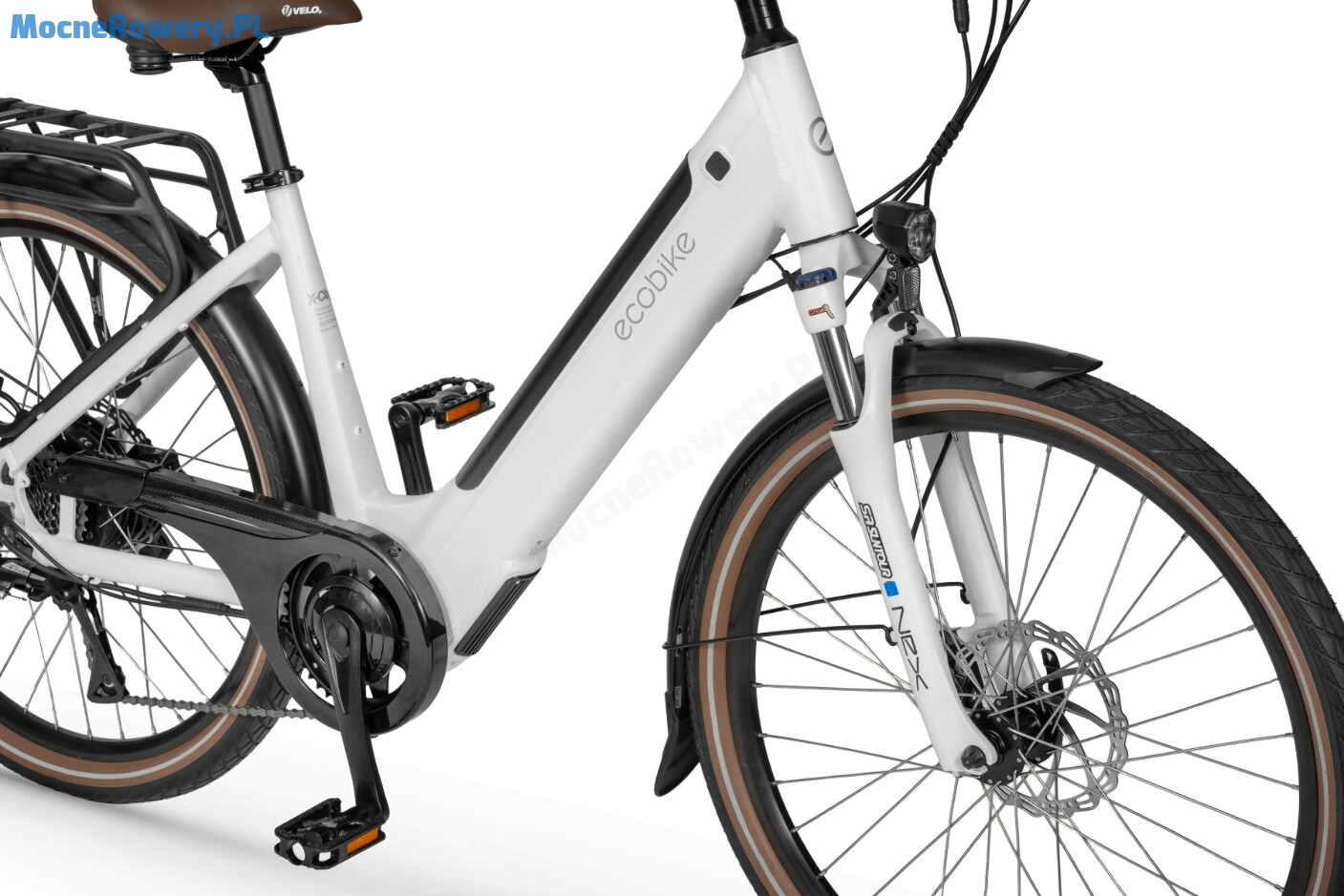 Amortyzator przedni w rowerze pełni kilka istotnych funkcji, dlaczego dobrze go mieć w rowerze? Ponieważ podnosi komfort jazdy, absorbuje wstrząsy i nierówności terenu, co przekłada się na zwiększenie komfortu jazdy. Podczas jazdy po wybojach, leśnym szlakiem lub polną drogą pozwala oponom lepiej przylegać do podłoża, co podnosi przyczepność kół roweru. W rowerze Ecobike X-City 26 White został zamontowany amortyzator SunTour NEX-DS-HLO o skoku 63 mm .