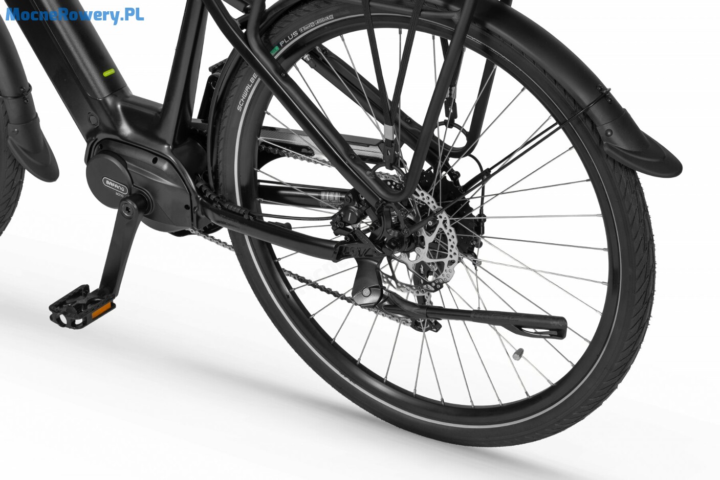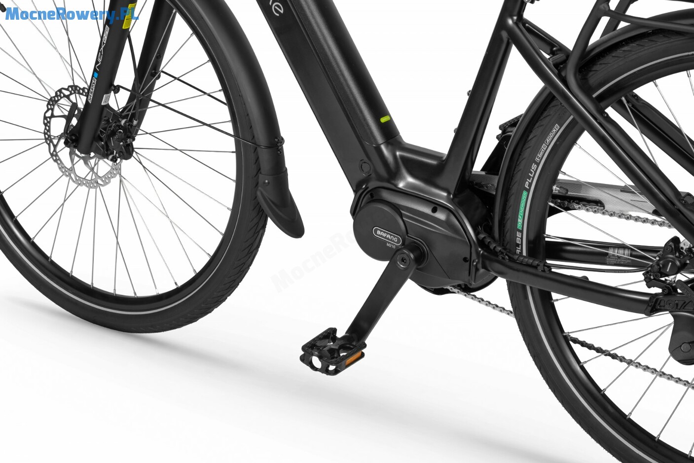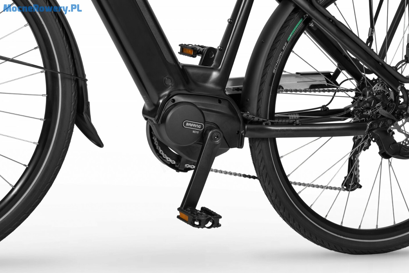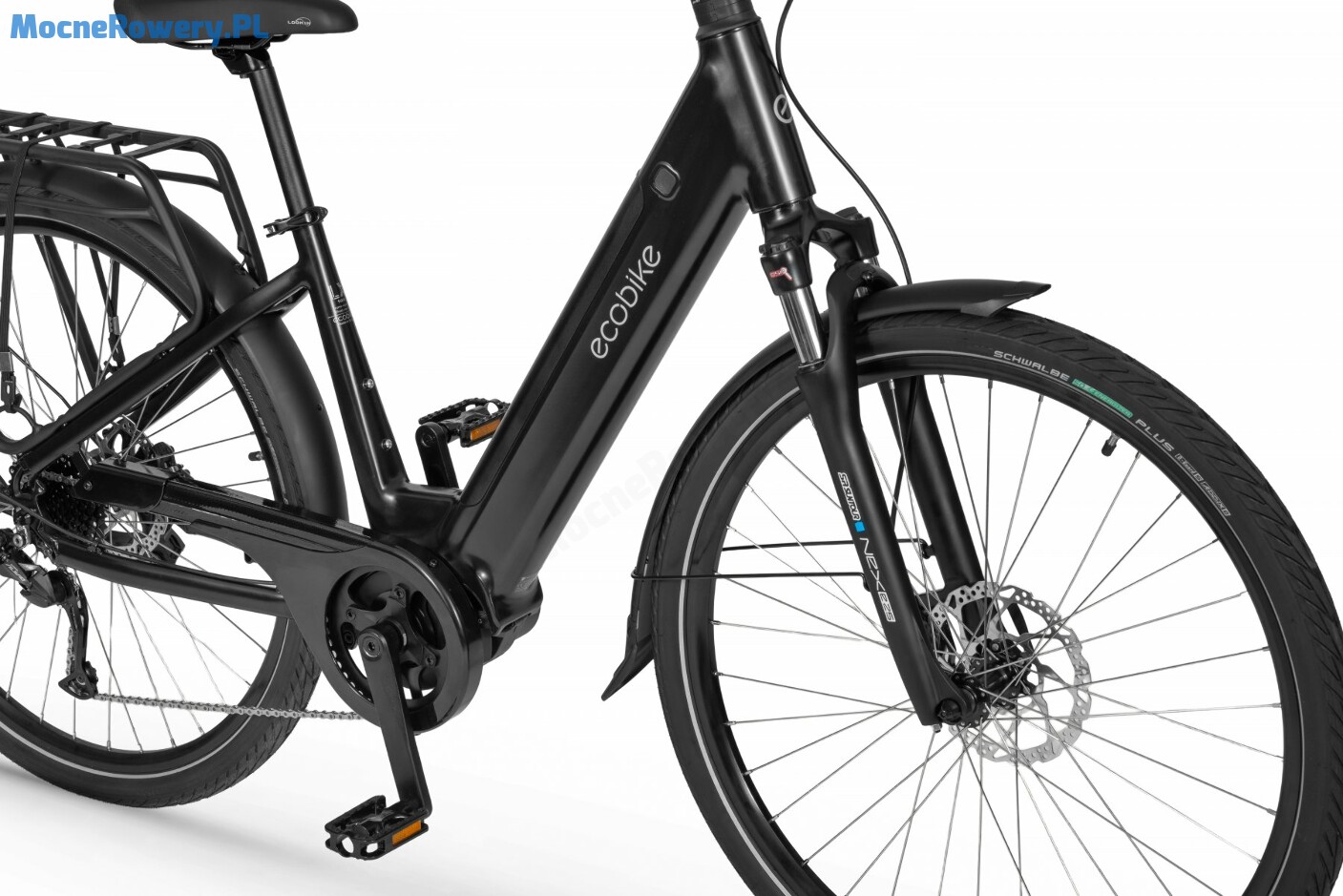 Dzięki silnikowi centralnemu Bafang M210 , podróżowanie na Ecobike LX 100 Black możliwe jest praktycznie w każdym terenie. To najbardziej wszechstronny i najlepszy rodzaj silnika stosowany w rowerach elektrycznych. Jego działanie jest płynne, a do tego oferuje większy moment obrotowy niż napędy w piaście tylnego czy przedniego koła. Charakteryzuje się większą czułością na rozpoczęcie pedałowania. Szybko reaguje na zmieniający się teren oraz kadencję. Moc jest przenoszona na koło za pośrednictwem łańcucha, co sprawia, że wspomaganie jest niezwykle płynne. Po pewnym czasie użytkownik przestaje zauważać, że silnik pomaga mu w pedałowaniu, skupiając się jedynie na jeździe. Synchronizacja działania jest po prostu doskonała! Jazda na rowerze Ecobike LX 100 Black przypomina jazdę na zwykłym rowerze, ale jest znacznie lżejsza. Silnik umieszczony jest nisko, co obniża środek ciężkości roweru, korzystnie wpływając na zwrotność i kontrolę. Jednocześnie nie zmniejsza drastycznie prześwitu, co jest istotne podczas pokonywania większych przeszkód.