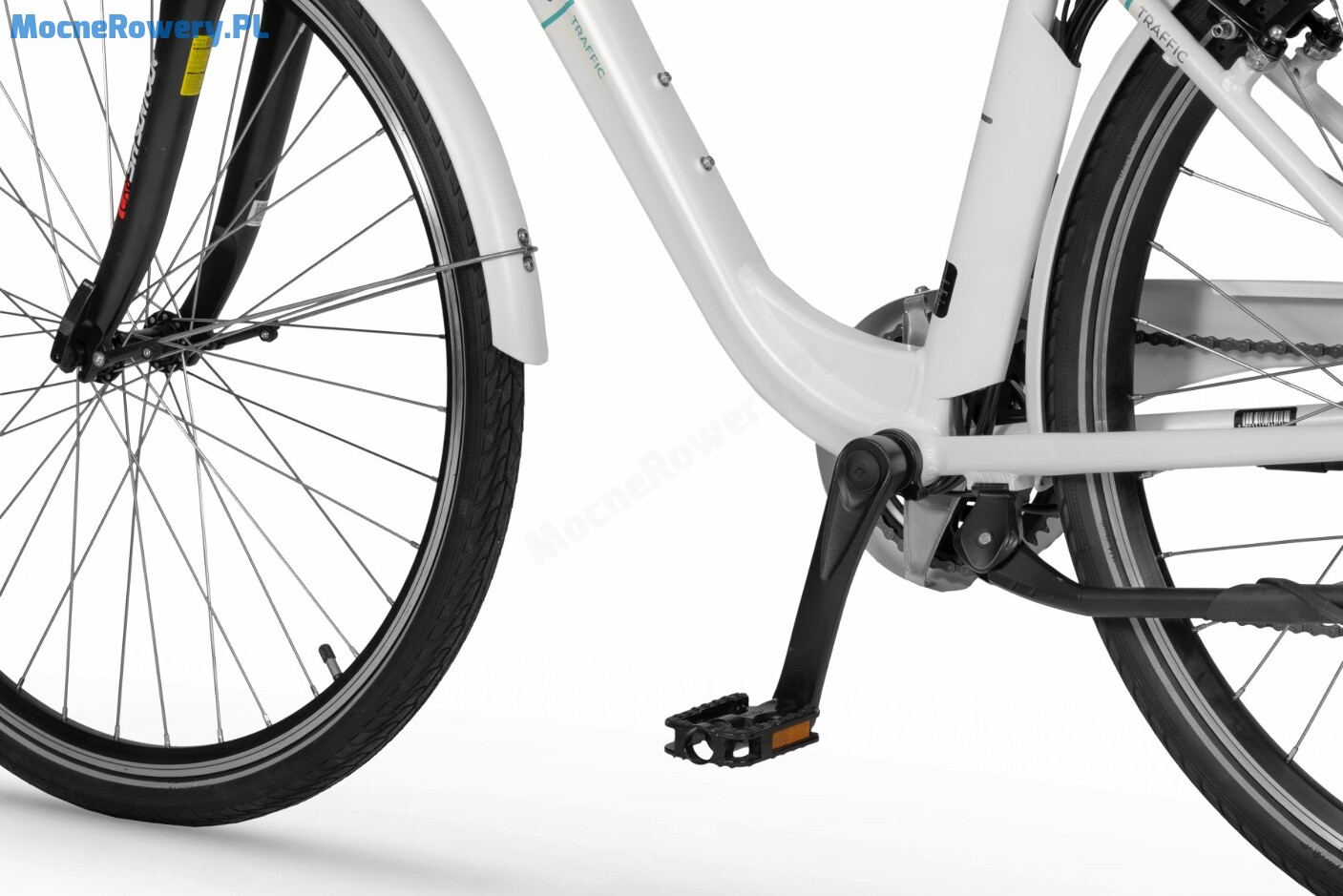 W rowerze Ecobike Traffic White wykorzystano silnik umieszczony z tyłu, wspomagający rowerzystę do prędkości maksymalnej do 25 km/h . Silnik jest umieszczony w piaście tylnego koła i współpracuje z akumulatorem o pojemności 417,6 Wh / 36 V . Jego znaczącą zaletą jest bezpośrednie przenoszenie mocy z silnika bezpośrednio na oponę. Dodatkowo charakteryzuje się mniejszym zużyciem łańcucha, gdyż nie używa go do przeniesienia mocy na tylne koło lecz robi to bezpośrednio. Proces montażu i demontażu koła z silnikiem jest niezwykle prosty, dzięki zastosowaniu hermetycznego złącza. Po uruchomieniu wspomagania i ruszeniu, użytkownik odczuje natychmiastowe i silne przyspieszenie, porównywane czasem do wiatru, wiejącego w plecy. Jazda ze wspomaganiem na Ecobike Traffic White to wspaniałe uczucie!