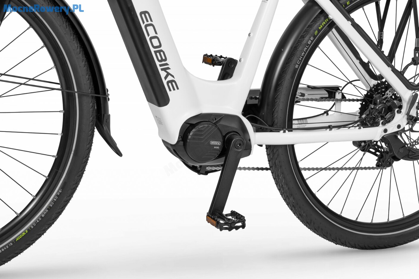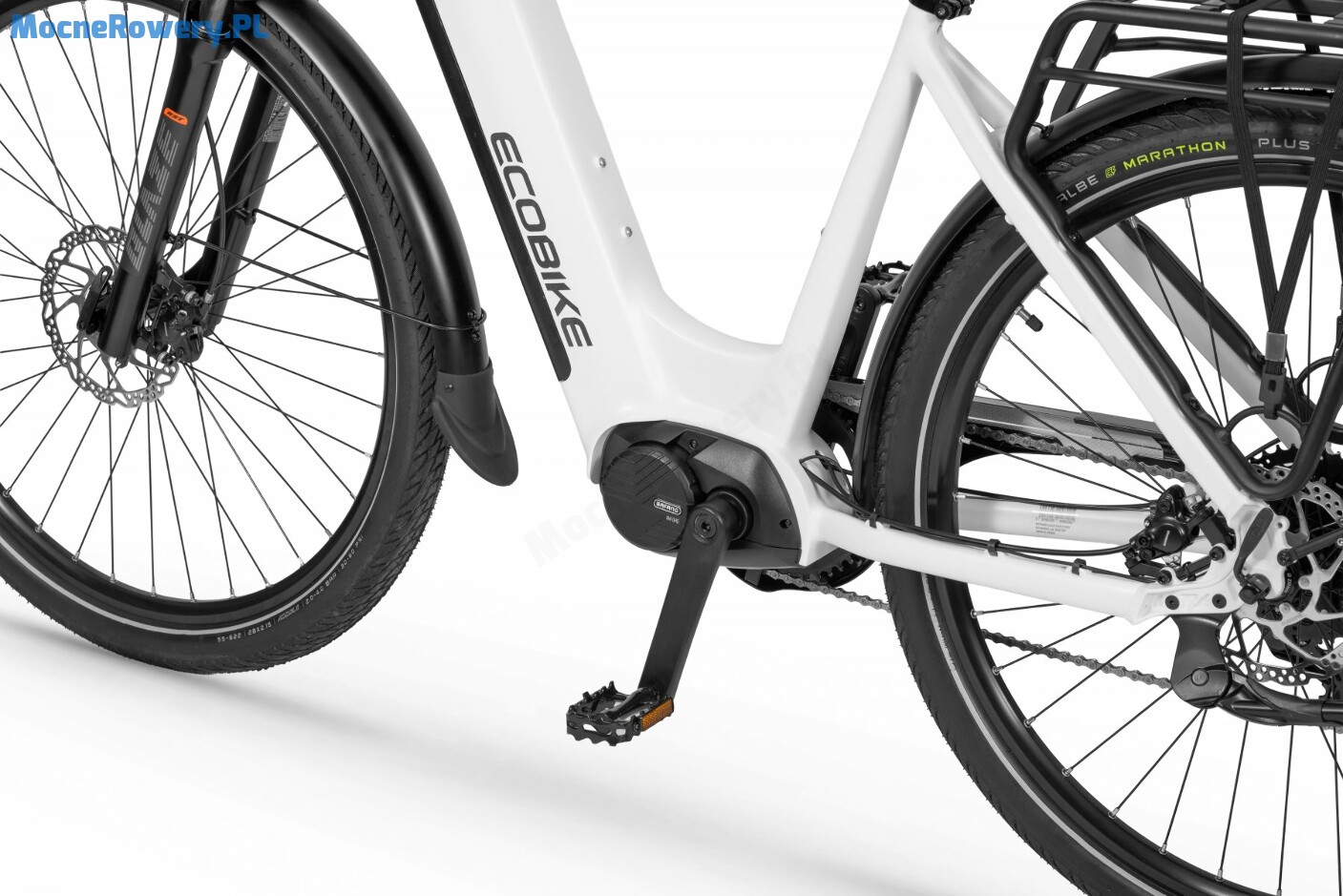 Dzięki silnikowi centralnemu Bafang M410HD , podróżowanie na ECOBIKE LX 300 WHITE 900Wh możliwe jest praktycznie w każdym terenie. To najbardziej wszechstronny i najlepszy rodzaj silnika stosowany w rowerach elektrycznych. Jego działanie jest płynne, a do tego oferuje większy moment obrotowy niż napędy w piaście tylnego czy przedniego koła. Charakteryzuje się większą czułością na rozpoczęcie pedałowania. Szybko reaguje na zmieniający się teren oraz kadencję. Moc jest przenoszona na koło za pośrednictwem łańcucha, co sprawia, że wspomaganie jest niezwykle płynne. Po pewnym czasie użytkownik przestaje zauważać, że silnik pomaga mu w pedałowaniu, skupiając się jedynie na jeździe. Synchronizacja działania jest po prostu doskonała! Jazda na rowerze ECOBIKE LX 300 WHITE 900Wh przypomina jazdę na zwykłym rowerze, ale jest znacznie lżejsza. Silnik umieszczony jest nisko, co obniża środek ciężkości roweru, korzystnie wpływając na zwrotność i kontrolę. Jednocześnie nie zmniejsza drastycznie prześwitu, co jest istotne podczas pokonywania większych przeszkód.