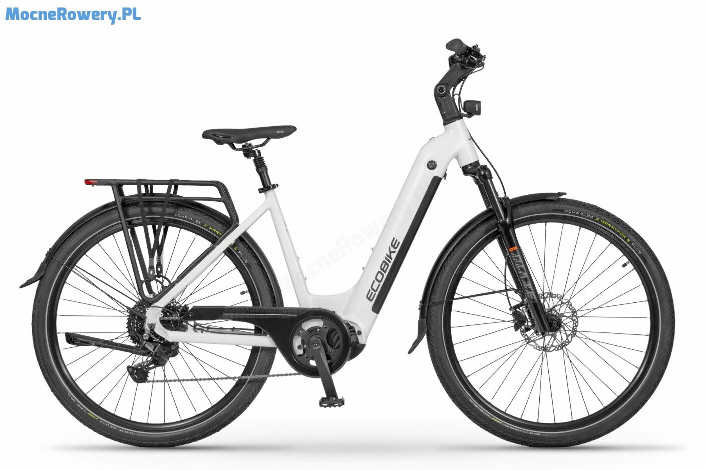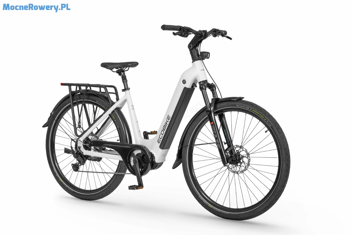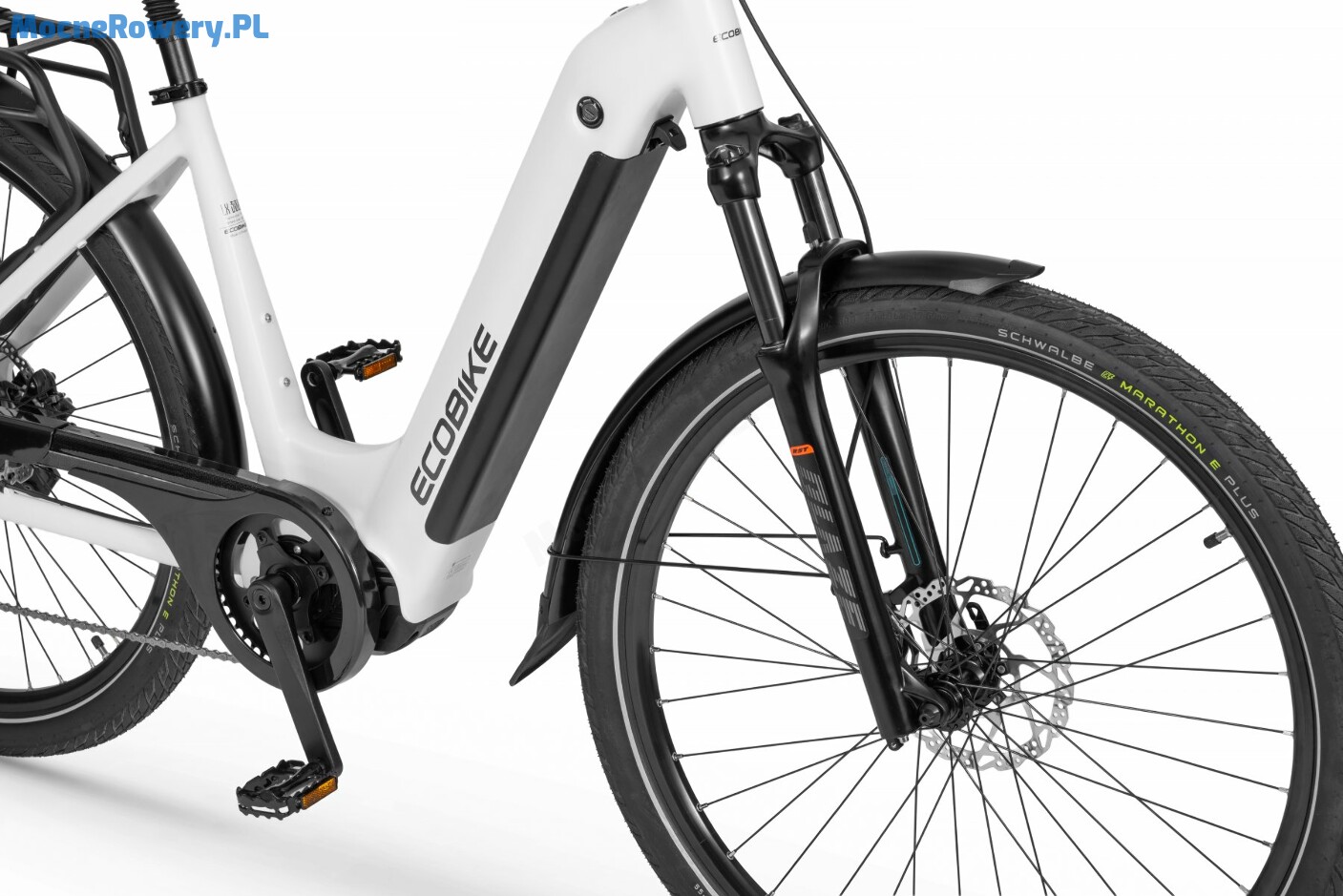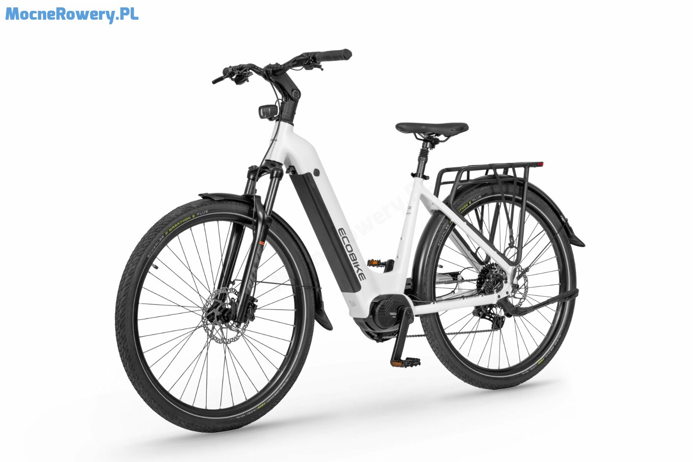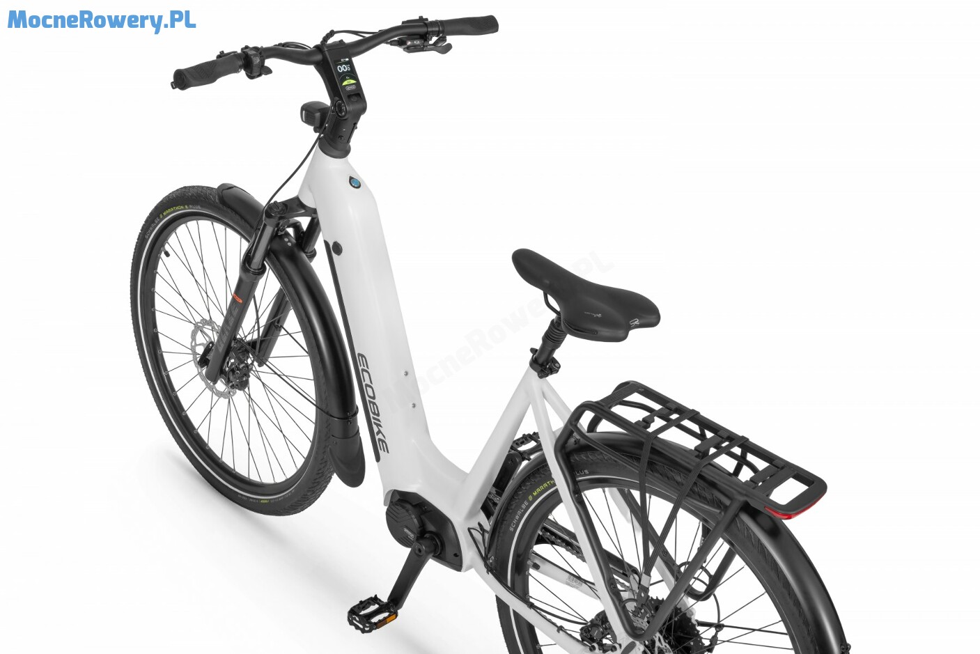 ECOBIKE LX 300 WHITE 900Wh ma w sobie duszę prawdziwego podróżnika. Jadąc na nim, każda wycieczka wywołuje uśmiech i sprawia ogromną przyjemność. Rower ten jest praktyczny, niezawodny i daje możliwość rozkoszowania się widokami. Zazwyczaj przyjemność z jazdy odczuwamy zjeżdżając w dół, a zdecydowanie rzadziej, gdy pod wzniesienie trzeba wyjechać. Na całe szczęście silnik Bafang M410HD sprawia, że jazda tym rowerem jest bardzo przyjemna, niezależnie od tego jak ukształtowany jest teren. ECOBIKE LX 300 WHITE 900Wh to rower trekkingowy, dlatego jest wygodniejszy od górskiego. Pozycja rowerzysty jest na nim bardziej wyprostowana. Można nim komfortowo przejechać jednorazowo dużo większy dystans bez zmęczenia.