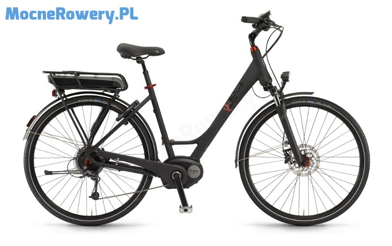 Rower trekkingowy niemieckiej marki Steiger Sinus. Centralny silnik Bosch, 9-biegowa przerzutka Deore, hydrauliczne hamulce tarczowe Shimano M355.