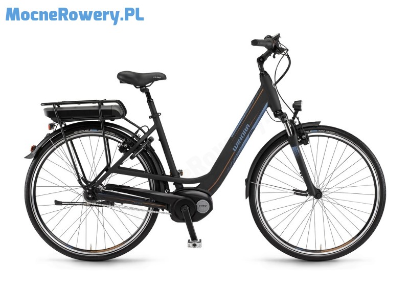 Uniwersalny rower trekkingowy Winora serii B. Centralny silnik Bosch, 7-biegowa przerzutka Shimano Nexus z "kontrą", hydrauliczne hamulce Magura HS11.